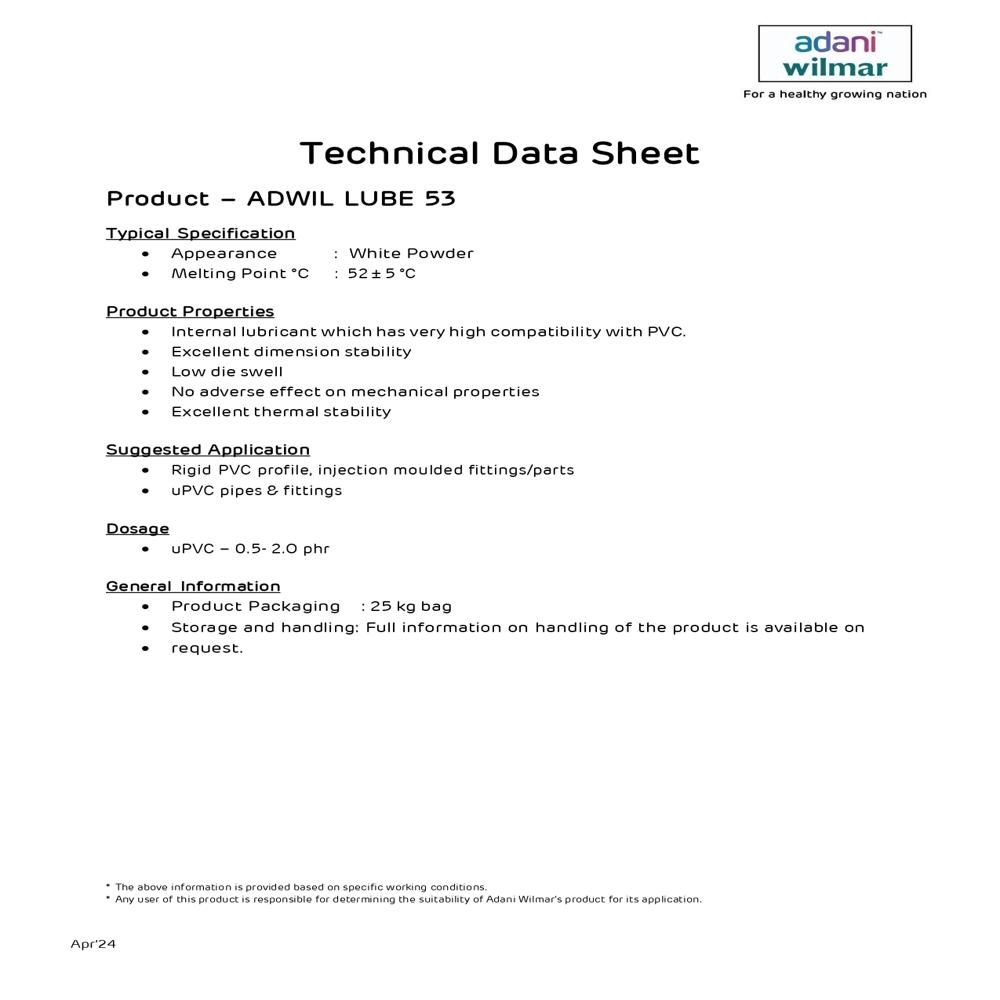 Properties : Properties: 1) ADWIL LUBE GP 60 it can be used to produce all kinds of PVC products as an internal lubricant. 2) ADWIL LUBE GP 60 has the excellent dispersion and provide good transparency effect. 3) It is white or slight yellow flakes or white powder, and it is nontoxic and odorless. 4) Improve the melt flowability during processing. 5) Provide lubricating property without lowering meltstrength.
